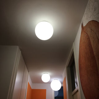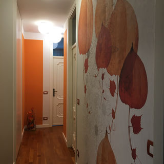 Il disimpegno notte da luogo stretto ed angusto è stato illuminato da sfere in vetro satinato a firma ARTEMIDE “Dioscuri” nelle diverse dimensioni e proporzioni che esaltano l’arancio della tinteggiatura a riquadri delle pareti, ripresa ed annunciata dalle “lanterne volanti” narrate dalla parati INKIOSTRO BIANCO.