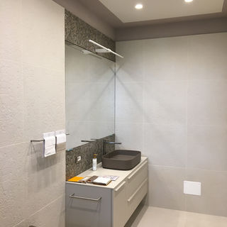 ll bagno padronale è stato ampliato e trasformato nella scelta dei materiali e nei toni di colore in una sala da bagno, con ampia doccia a filo-pavimento (FIORA), con lastra in cristallo temperato ad incasso nel contro-soffitto, senza porta, con illuminazione interna; sanitari colorati “Terre di CIELO” e rubinetteria di casa GESSI in Finox. I rivestimenti e le tinteggiature sono tutti nelle tinte delle terre, in gres porcellanato e in mosaico: ceramica d’autore di MUTINA “Déchirer la Suite” by Patricia Urquiola” nella tonalità del bianco calce, intervallata in “zona acqua” dal mosaico vetroso SICIS serie “Antigua” nelle tonalità dei tortora madreperlati.
